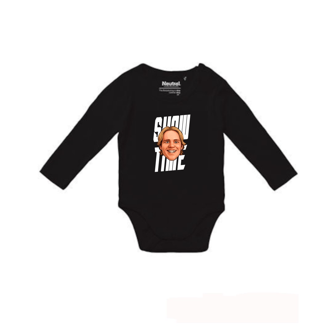Ekologisesta ja Reilu kauppa -sertifioidusta 100 % puuvillasta valmistettu vauvojen pitkähihainen body SHowtime 2025 -logolla. Approved by Petteri "Showtime" Rimpinen.